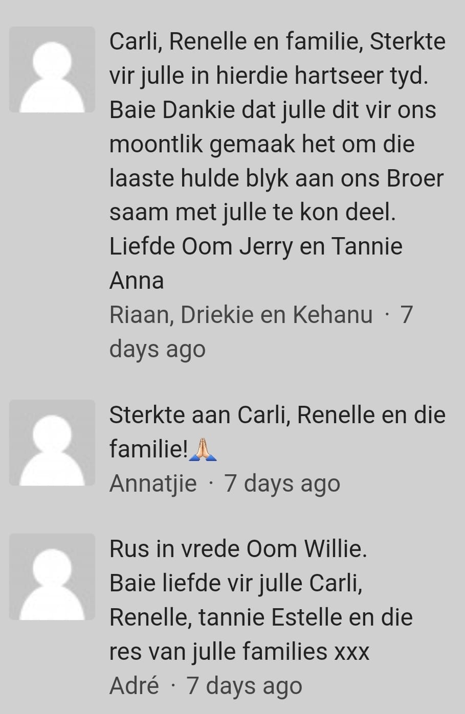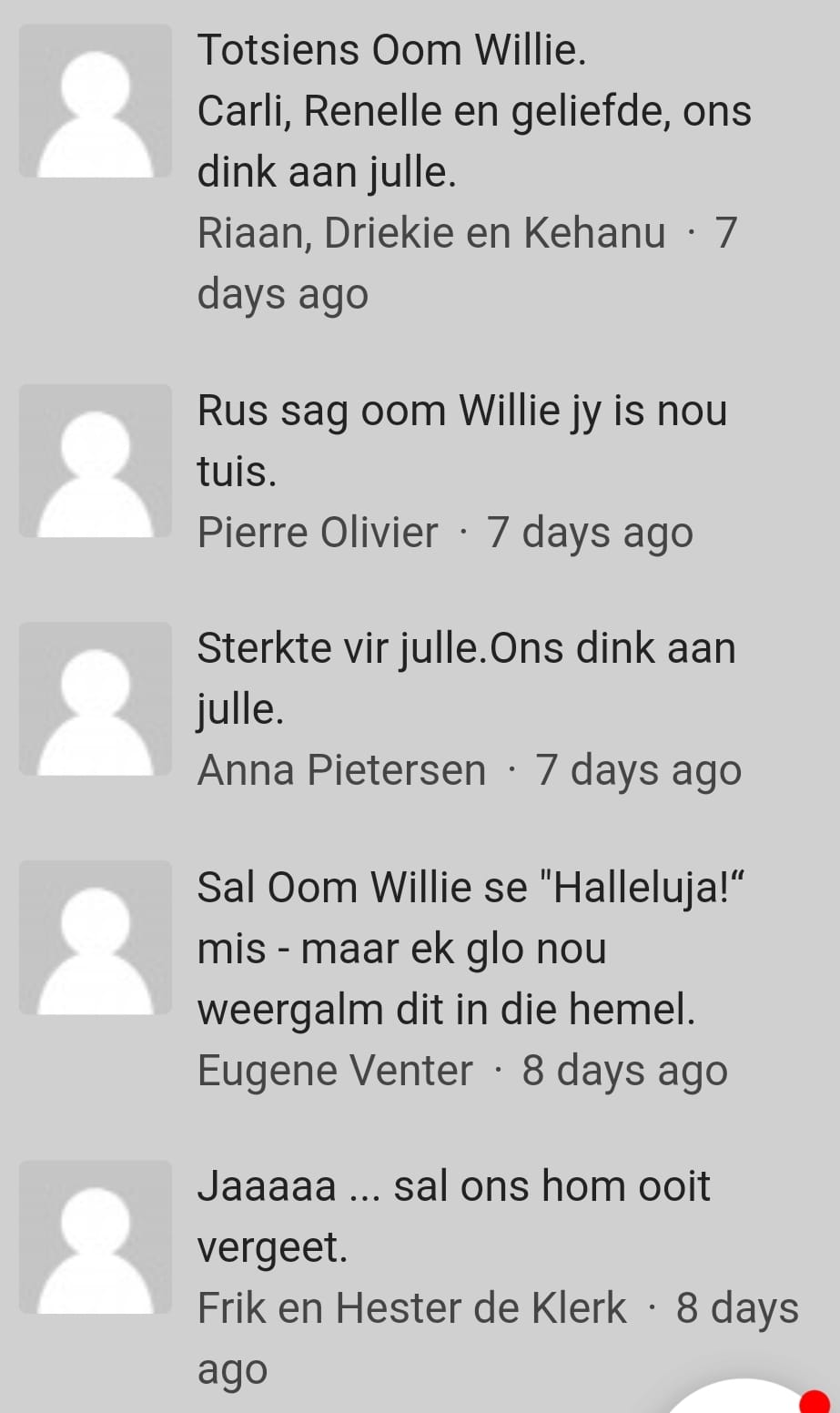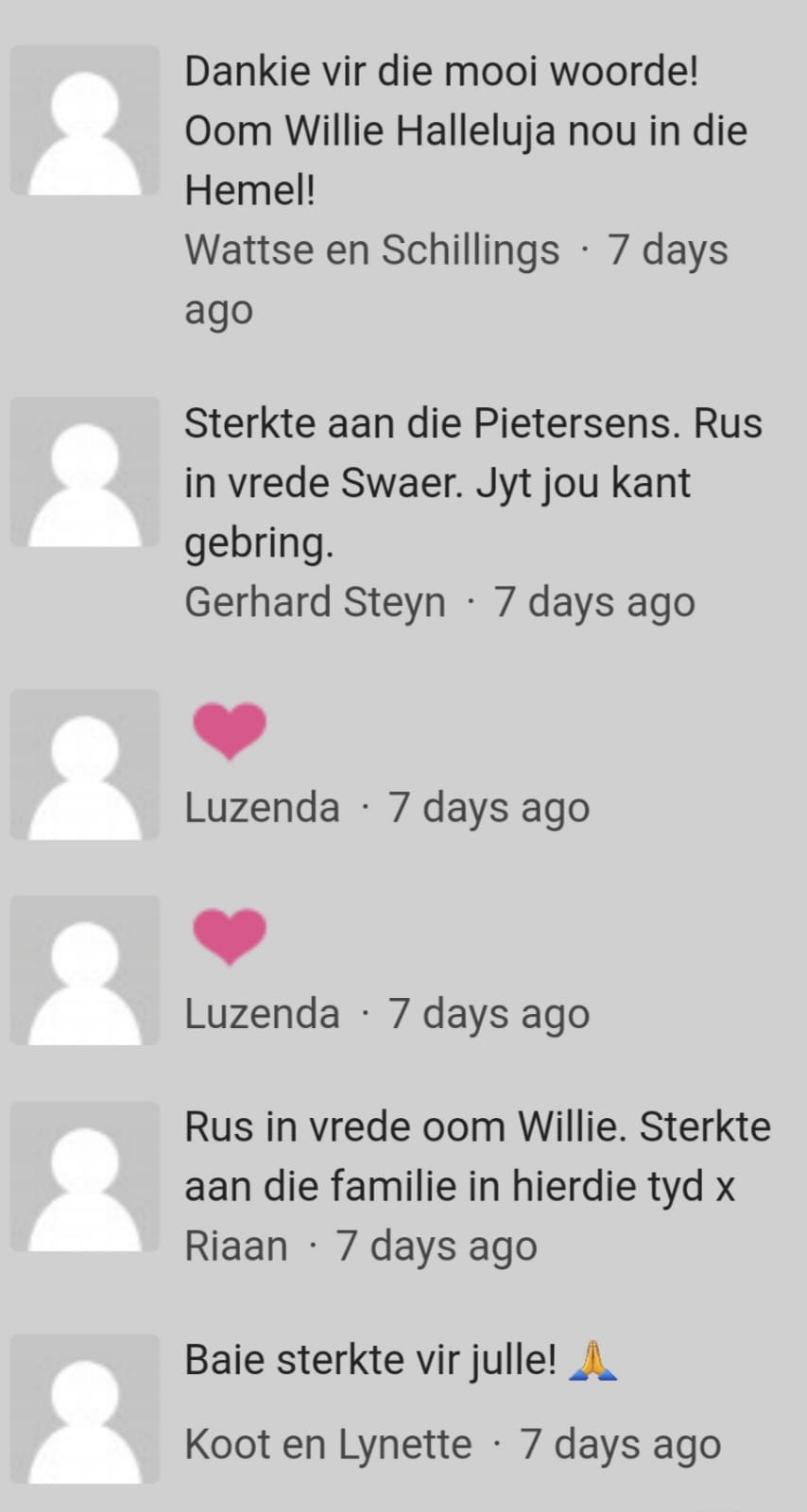 Ek het nooit vir Mika geken nie, en tot nou toe, nog nooit ontmoet nie, maar ekt haar deur sosiale media gaan opsoek na Gianni se dood en ons het dikwels op mekaar se skouers gehuil. Deur die jare het ons kontak gehou en kan ek haar ook ‘n vriendin noem. Alhoewel sy natuurlik in ouderdom, my ma kon wees. Ouderdom tel mos nie altyd nie.