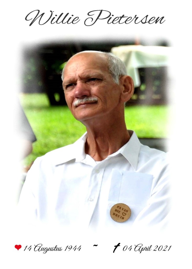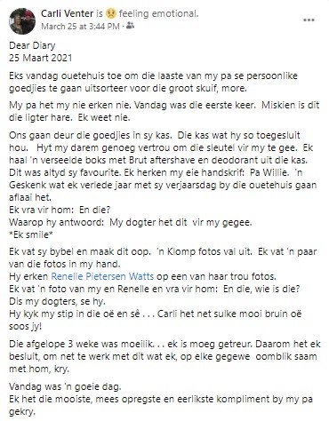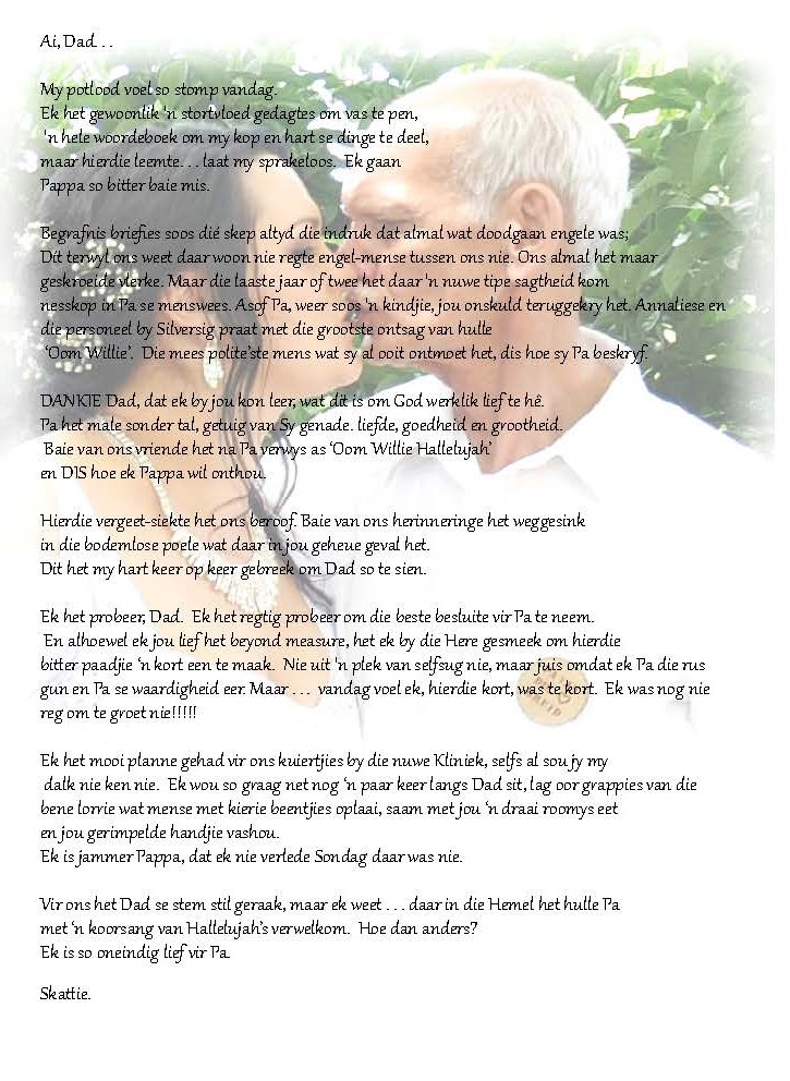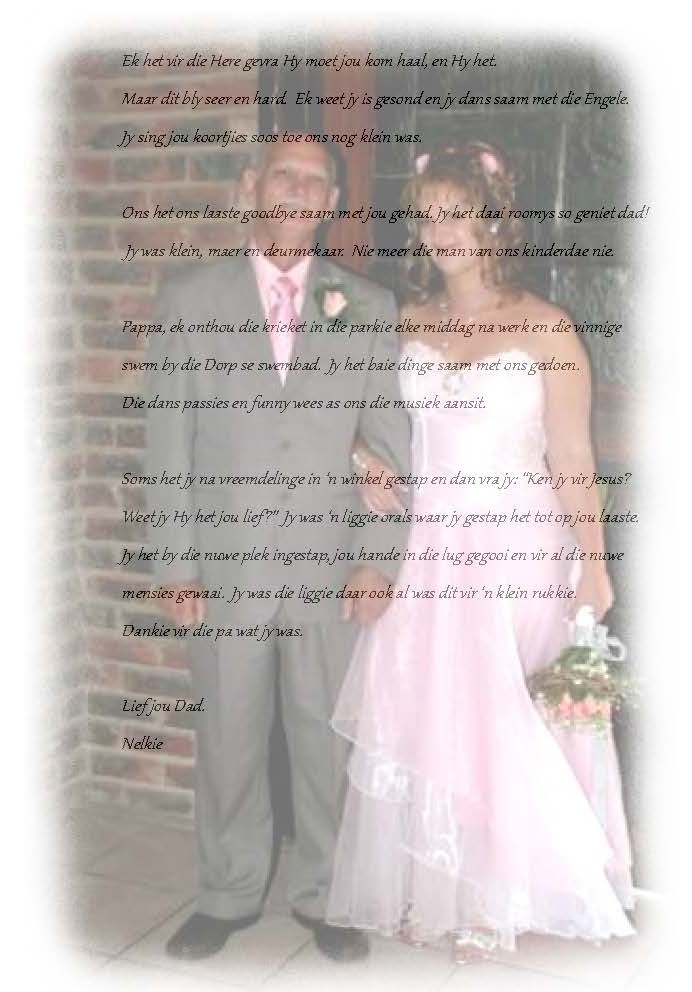 Begin 2005 verloor sy haar pa, selfmoord. . . En alhoewel hierdie ‘n bitter bitter moeilike tyd was, hou sy vandag nog vas aan sy bundel vol gedigte en put vrede uit die hartsgeheime, diepte en wyshede wat hy daarin ‘met haar’ deel. Hoe sou sy ooit met die dood van haar pa kon raai, dat dit nie die moeilikste ding was, waardeur sy in haar lewe sou moes werk nie.